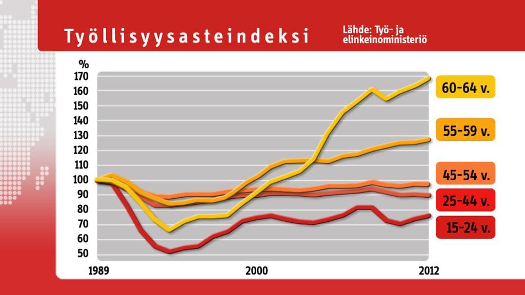 Saarikoski puolustaa heikompaa. Tilastojen valossa nuorten työllisyysasteindeksi ei ole noussut kertaakaan lama-aikaa edeltäneelle tasolle. Sama koskee keski-ikäisiä työntekijöitä. Sen sijaan kuuttakymppiä lähentelevät ja sen ylittäneet porskuttavat omassa sarjassaan.
