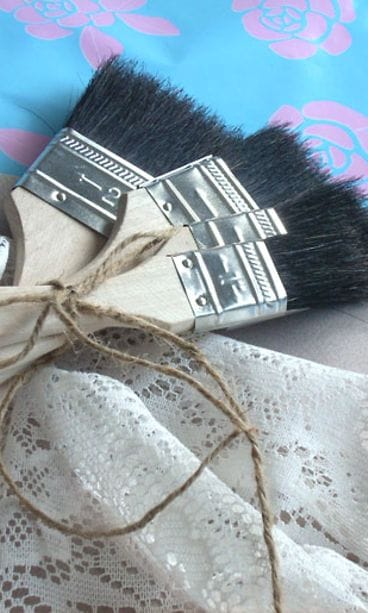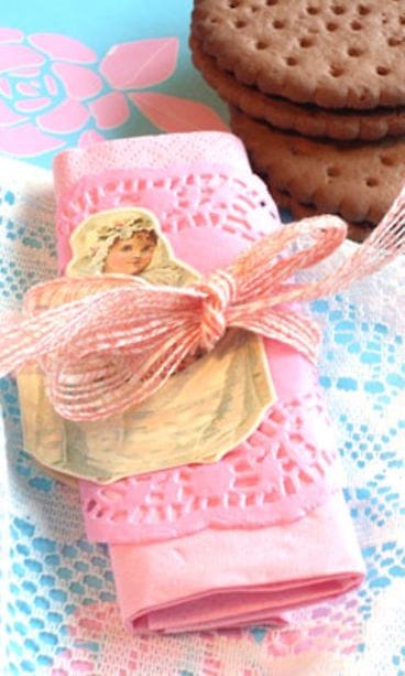 * Kääri servietit rullalle ja koristele ne pienellä pyöreällä kakkupaperilla ja kangasnauhalla.