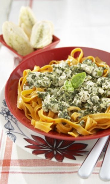 Sulata pinaattipalat kattilassa ja sekoita joukkoon tuorejuusto. Mausta kastike ripauksella mustapippuria.