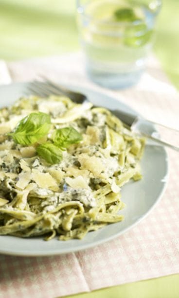 Valuta keitetty pasta ja sekoita kastike kuuman pastan joukkoon. Tarjoa heti parmesaaniraasteen kanssa.