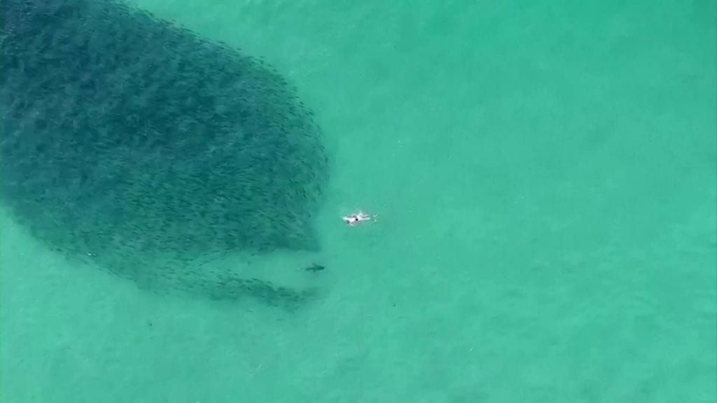 Dronella kuvatusta videosta näkyy, kuinka kymmeniä ihmisiä ui aamu-uinnilla lähellä suurta kalaparvea.