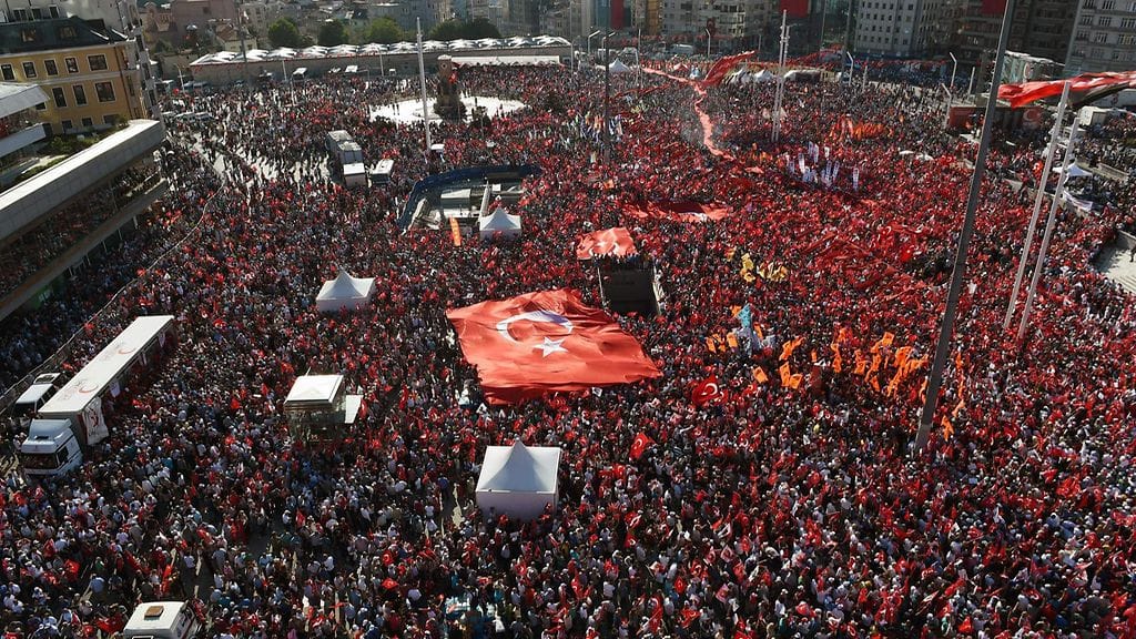 Aukio peittyi lippumereen isänmaallisessa mielenosoituksessa, jota kutsuttiin "demokratian festivaaliksi". Presidentti Recep Tayyip Erdoganin tukijat ovat kansoittaneet kaupungin aukioita joka ilta vallankaappausyrityksen jälkeen, mutta uutta sunnuntain kokoontumisessa oli se, että Erdoganin kannattajien lisäksi mukana oli myös suurin oppositiopuolue CHP.