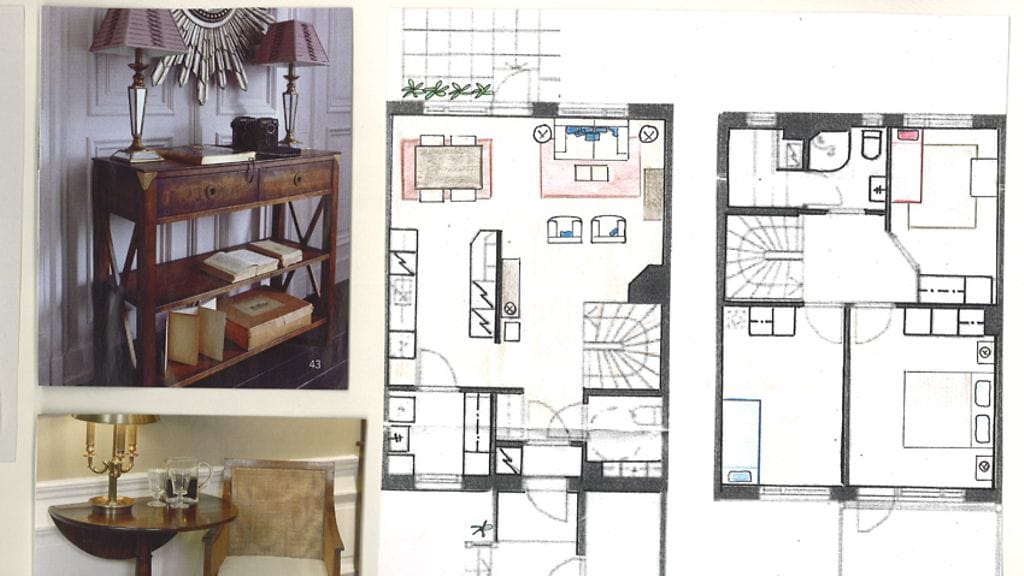 Käytävän suunnaton koivunvärinen lipasto korvataan tummapuisella laatikollisella sivupöydällä, jonka päälle asetetaan kaksi pöytävalaisinta. Viereen selkänojallinen sirolinjainen tuoli.