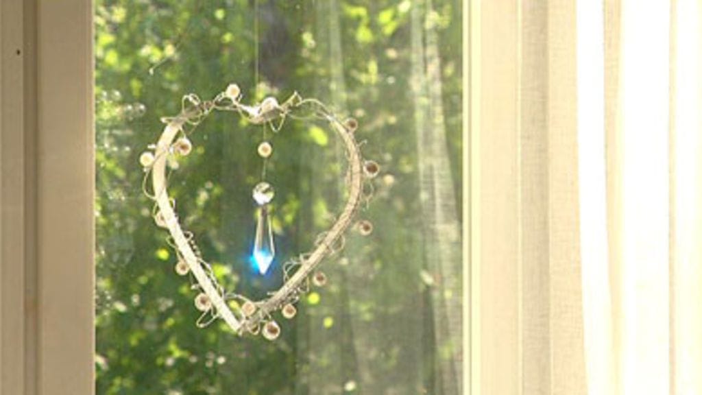 Laita ripustamista varten kaksi hopealankaa tai siimaa sydämen korkeimmista kohdista kiinni ja ripusta koriste ikkunaan.