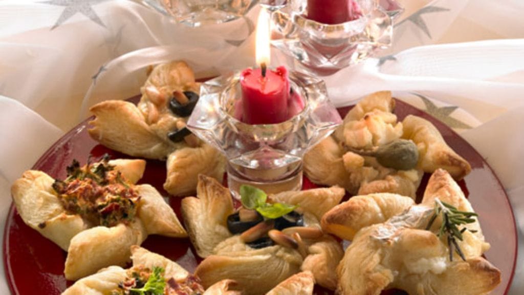 Levitä taikinalevyt leivinpaperille uunipellille ja anna niiden sulaa noin 15 minuuttia. Kaaviloi sulaneita levyjä hieman pidemmiksi, 21 sentin pituisiksi. Jaa jokainen levy kolmeksi 7 x 7 cm -neliöksi. Tee neliöiden kulmiin vinot viillot kohti tortun keskustaa (puoleen väliin). Nosta joka toinen kulma ylös ja nipistä ne keskelle alas painaen suppuun.