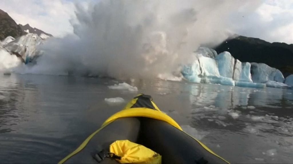 Alaskassa melomassa olleet Andrew Hooper ja Josh Bastyr todistivat Spencerin jäätiköllä hurjaa tilannetta, kun valtava määrä jäätikköä sortui yllättäen veteen. Romahtanut vuori sai aikaan 2-3 metrisen aallon, joka alkoi keinuttaa miesten kajakkeja.