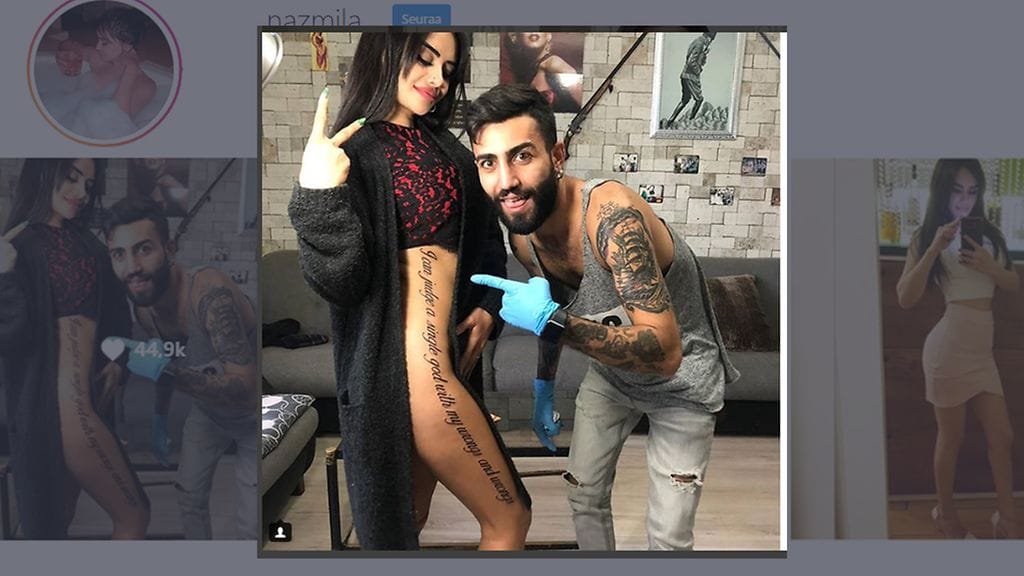 Instagram-malli Naz Mila joutui some-pilkan kohteeksi otettuaan tatuoinnin, jossa lukee "voin tuomita yhtä jumalaa vääryyksilläni ja vääryyksilläni".