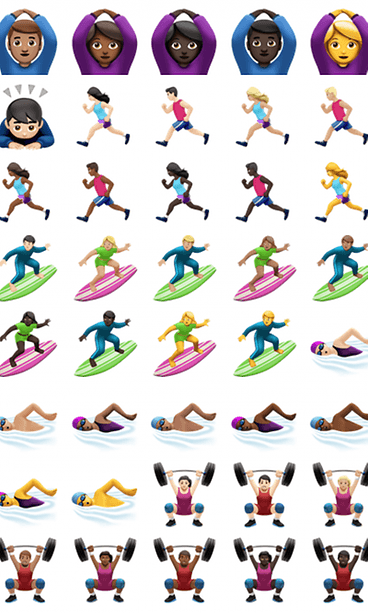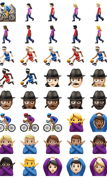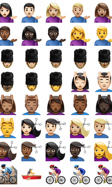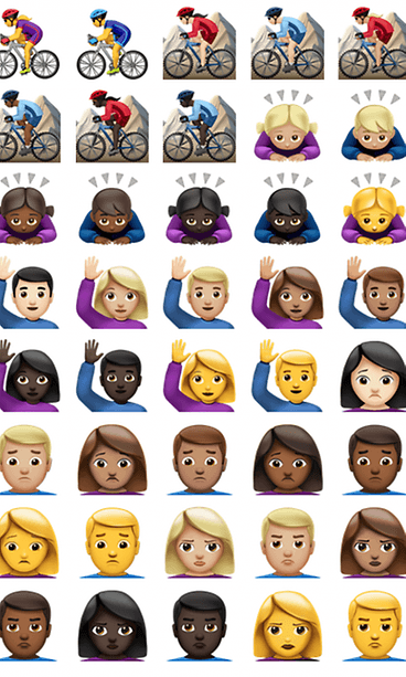 Lisäksi alta löytyvät kuvat iOS 10:n uusista 37 emojista kaikkina eri versioinaan. Emojit voivat erota muun muassa hahmon ihonväriltä.