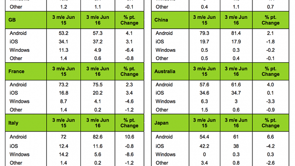 Sekä Androidin että Applen markkinaosuuden kasvulle tilaa useimmilla markkinoilla on tosin tehnyt Windows-puhelinten hurja myynnin ja markkinaosuuden romahdus. Windows-puhelinten markkinaosuus suurissa EU5-maissa romahti 10 prosentista 4,5 prosenttiin. Samalla Android-puhelinten osuus kasvoi 5,5 prosenttiyksiköllä 76,8 prosenttiin ja iPhonen 0,7 prosenttiyksiköllä 18,2 prosenttiin.