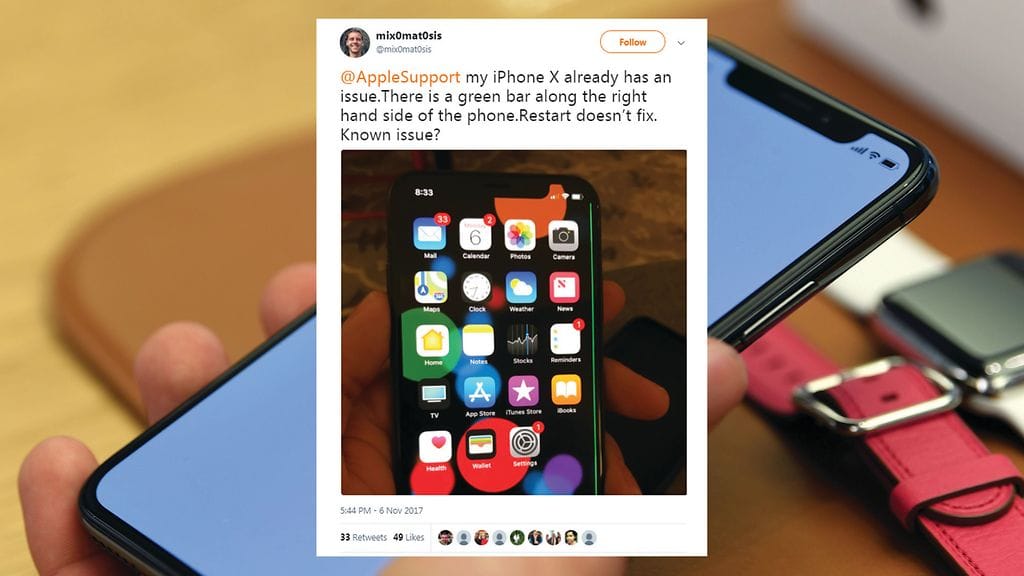 Aiheesta kertovan MacRumors -nettisivun mukaan useat käyttäjät ovat jakaneet kuvia, joissa heidän uuden iPhone X:n näyttöön on ilmestynyt vihreä viiva.