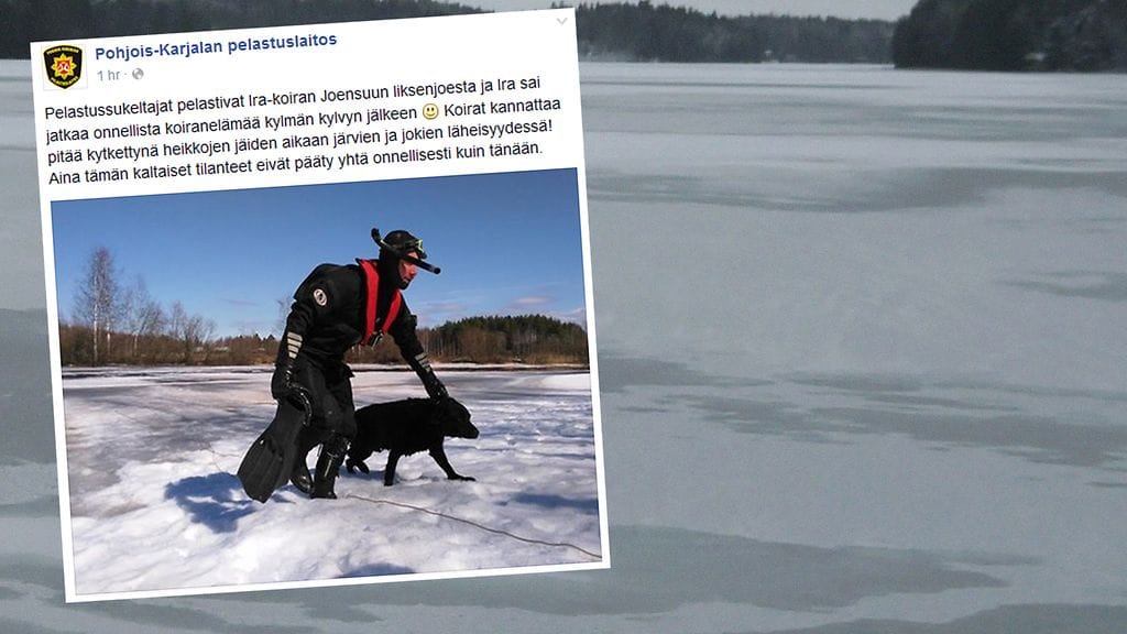 Pelastussukeltajat hakivat koiran joesta. Ira odotti rauhallisesti auttajia etutassut jään päällä. Koira käveli rantaan ja omistaja vei sen lämmittelemään.