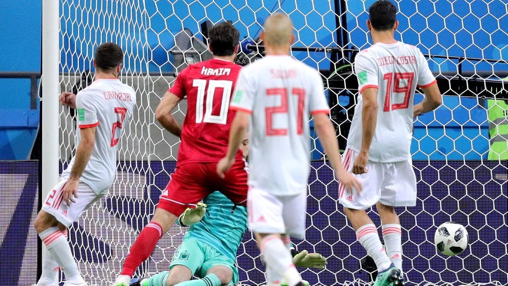 Iranin Saeid Ezatolahi ampui pallon häkkiin jalkapallon MM-kisojen alkulohko-ottelussa Espanjaa vastaan, kun Espanja johti ottelua 1–0. Osuma kuitenkin hylättiin.