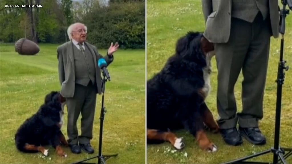 Irlannin presidentti Michael D. Higgins oli antamassa haastattelua RTÉ News -kanavalle Dublinissa, kun hänen berninpaimenkoiransa Misneach varasti huomion. Koomisesta tilanteesta uutisoivat useat mediat, kuten Irish Central ja Huffpost.