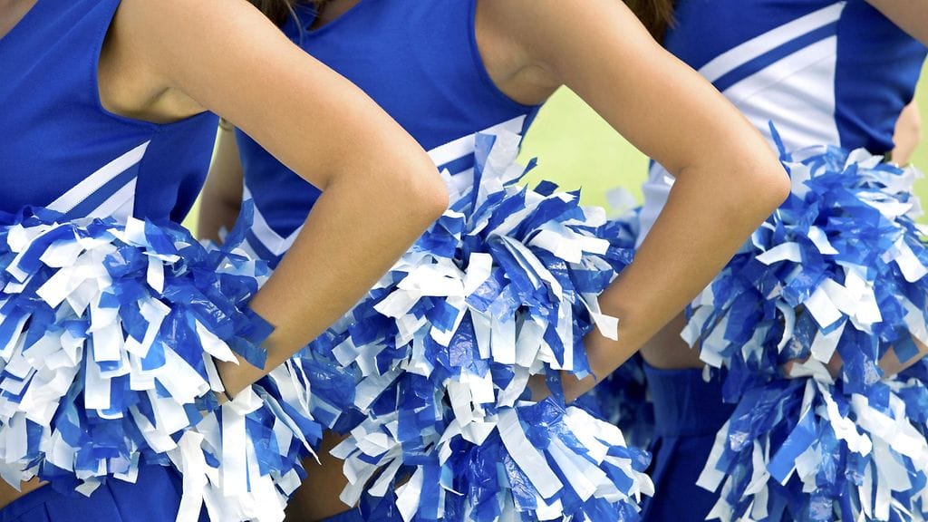 Yleisön joukossa istunut isä nousee videolla seisomaan ja esittää cheerleadereiden esityksen itse katsomosta käsin yhtä aikaa tyttärensä joukkueen kanssa aina potkuja myöten.
