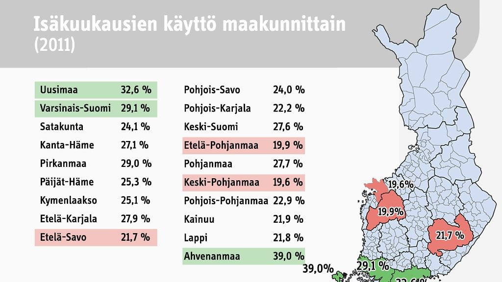 Yllättävää isäkuukausien käytössä on niiden jakautuminen eri alueiden välillä. Maakunnista Ahvenanmaa on selkeästi ykkösenä. Vähiten isäkuukautta hyödynnetään Etelä- ja Pohjois-Pohjanmaalla. Suurissa kaupungeissa isäkuukausia pidetään Oulua lukuun ottamatta enemmän kuin Suomessa keskimäärin.