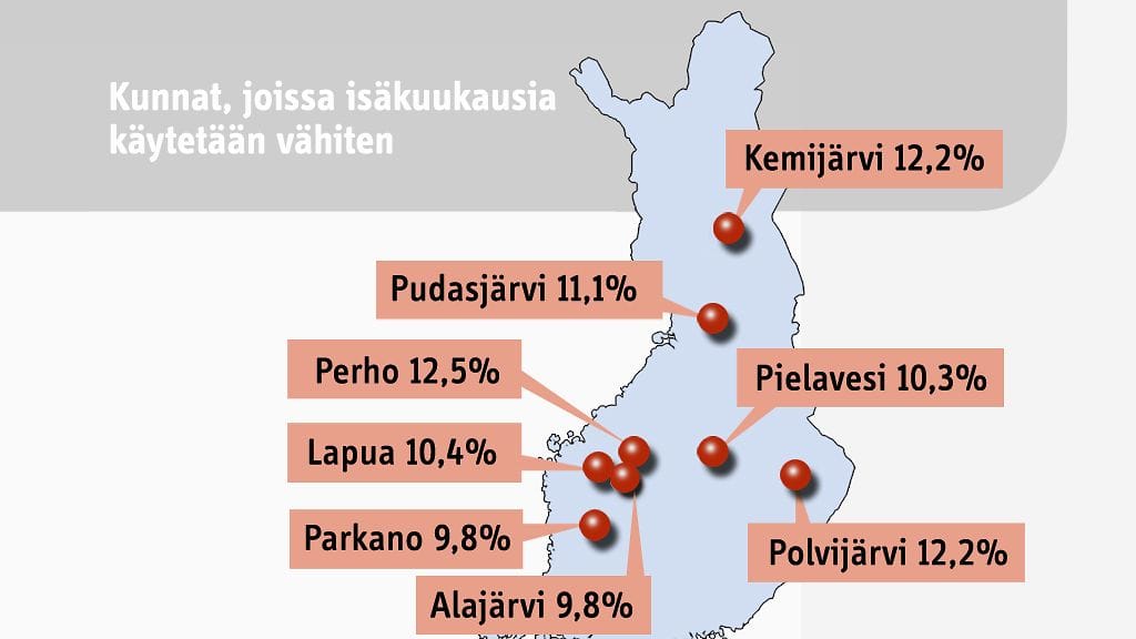 Kuntakohtaisesti kaikkein vähiten isäkuukausia käytetään Parkanossa ja Alajärvellä.