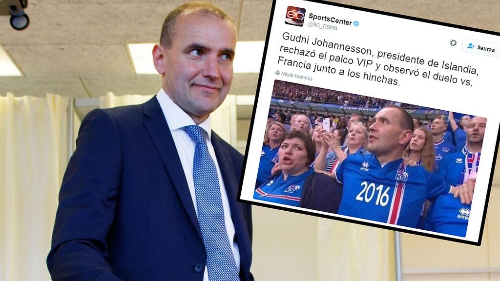 Kaiken kruunuksi 48-vuotias presidentti seurasi EM-kisojen puolivälierää keskellä Islannin faniporukkaa. Ja sinisessä pelipaidassa - tietysti.