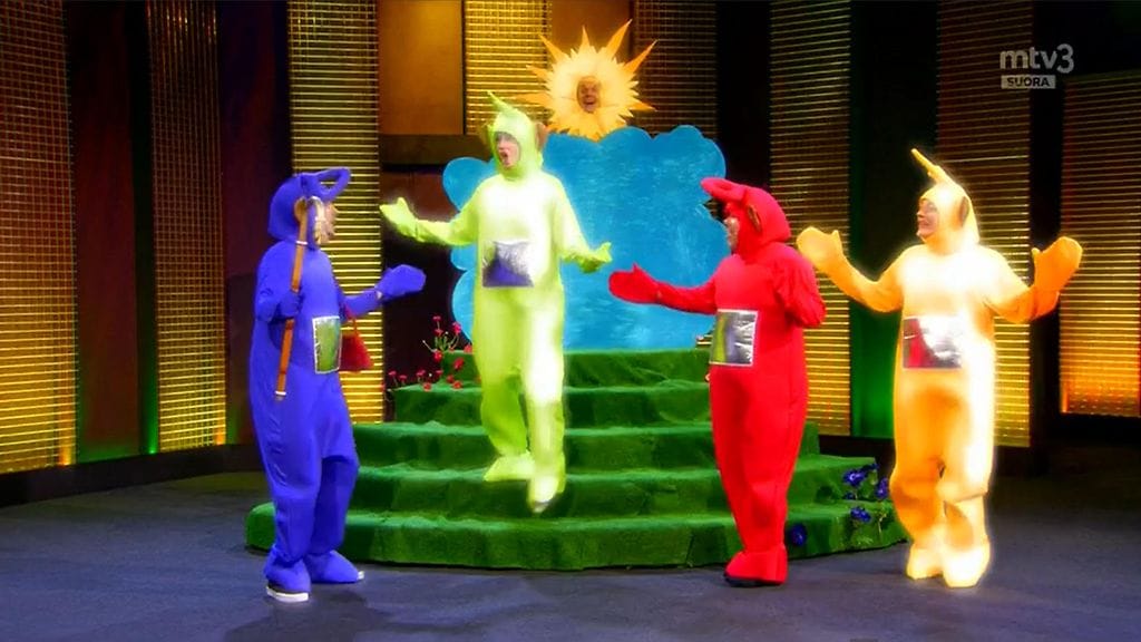 Putouksen neljännessä suorassa lähetyksessä nähtiin Teletappi-aineinen sketsi.
