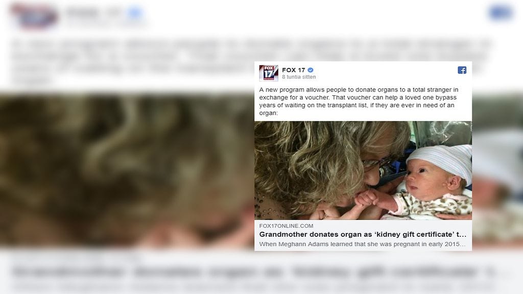 Isoäiti lahjoitti tuntemattomalle munuaisensa, jotta hänen tyttärentyttärensä olisi myöhemmin oikeutettu saamaan tarvitsemansa munuaissiirron.