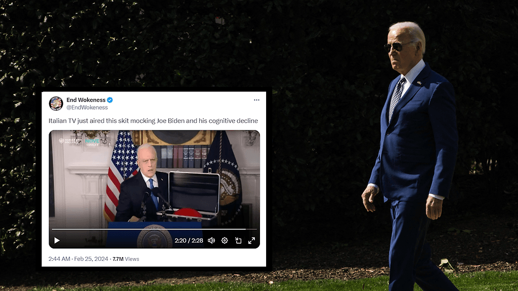 Fratelli di Crozza -sarjassa esitetyssä kaksiminuuttisessa kohtauksessa Joe Bideniä esittävä koomikko Maurizio Crozza kompastelee puhujakorokkeen ohi, ja kamppailee muistinsa kanssa sekoittaen maiden johtajat ja historialliset tapahtumat.
