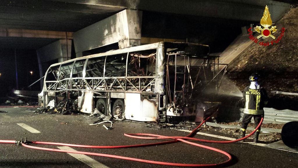 Onnettomuus tapahtui yöllä Veronassa, kun linja-auto osui moottoritiellä toistaiseksi tuntemattomasta syystä pylvääseen ja syttyi palamaan.