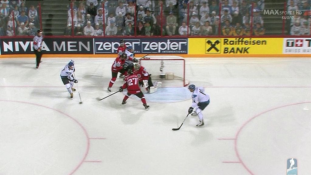 Savinaiselle tarjoili syötön täysin vapaaseen paikkaan Petri Kontiola. Savinainen tälläsi kiekon tyhjiin.
