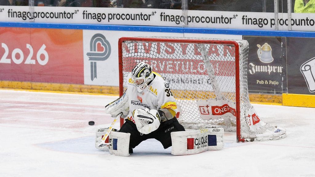 Kärppien maalilla torjuva Veini Vehviläinen torjui kuitenkin kiekon komealla räpylätorjunnallaan.