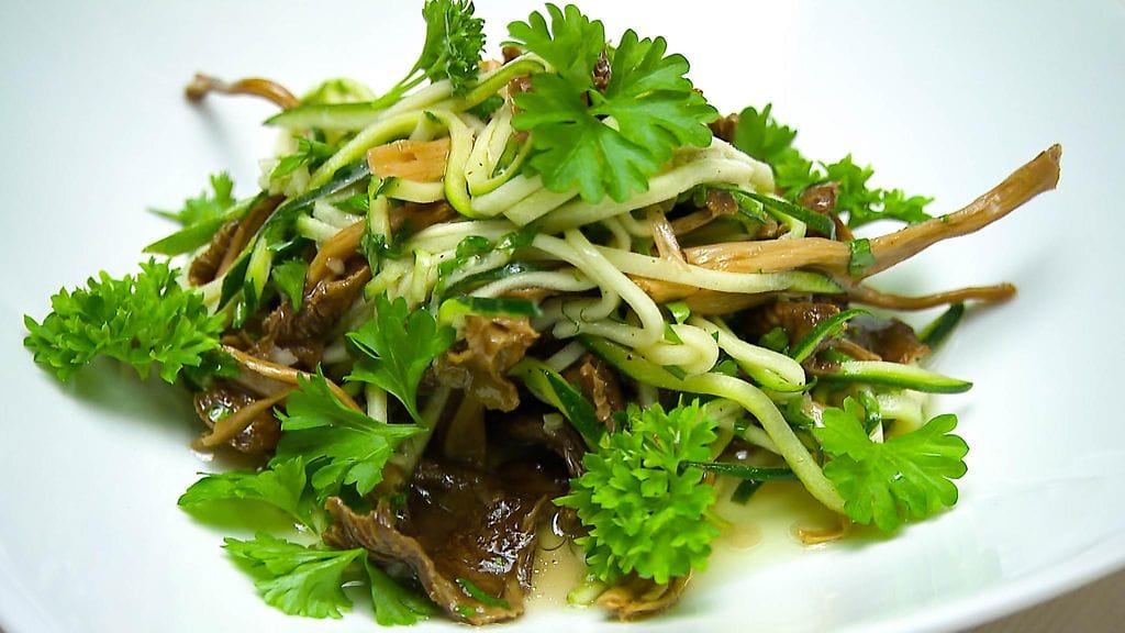 Kesäkurpitsa‐suppilovahverosalaatti