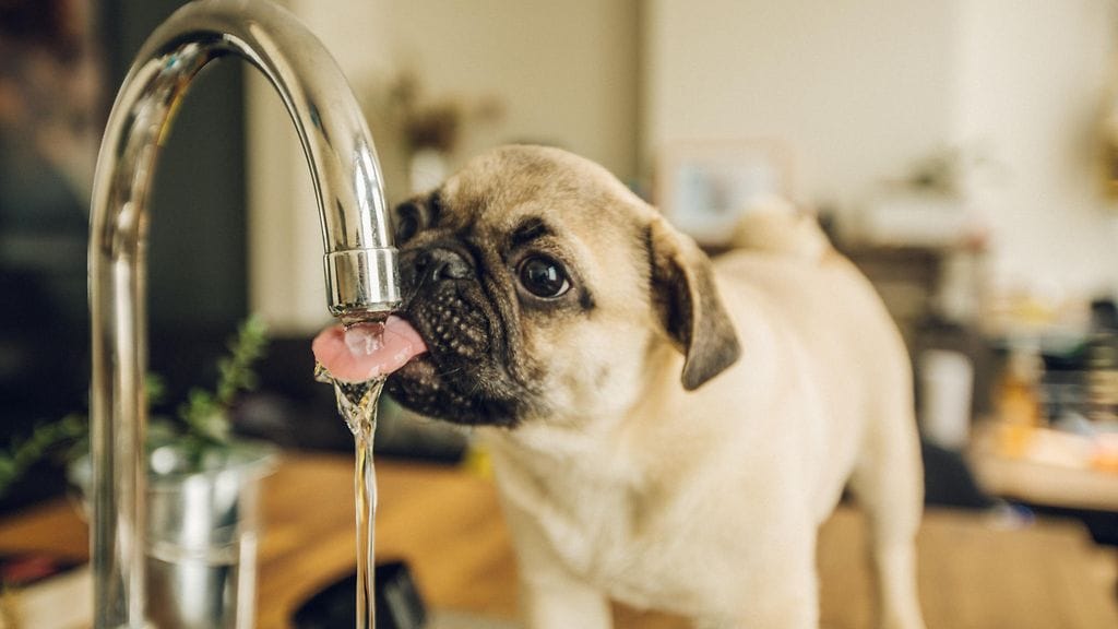 Videolla janoinen mopsi yrittää juoda, mutta ei hoksaa juovansa hanan varjokuvasta.