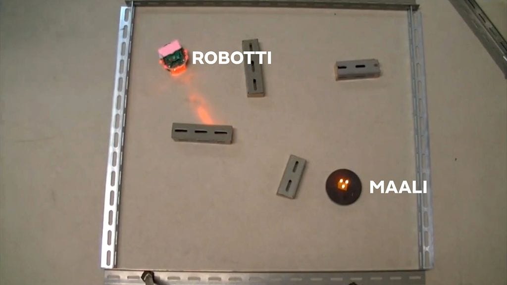 Katso ylhäällä olevalta videolta, kuinka maailman ensimmäinen ”ajatteleva” robotti selvitti esteet ja löysi maalin!