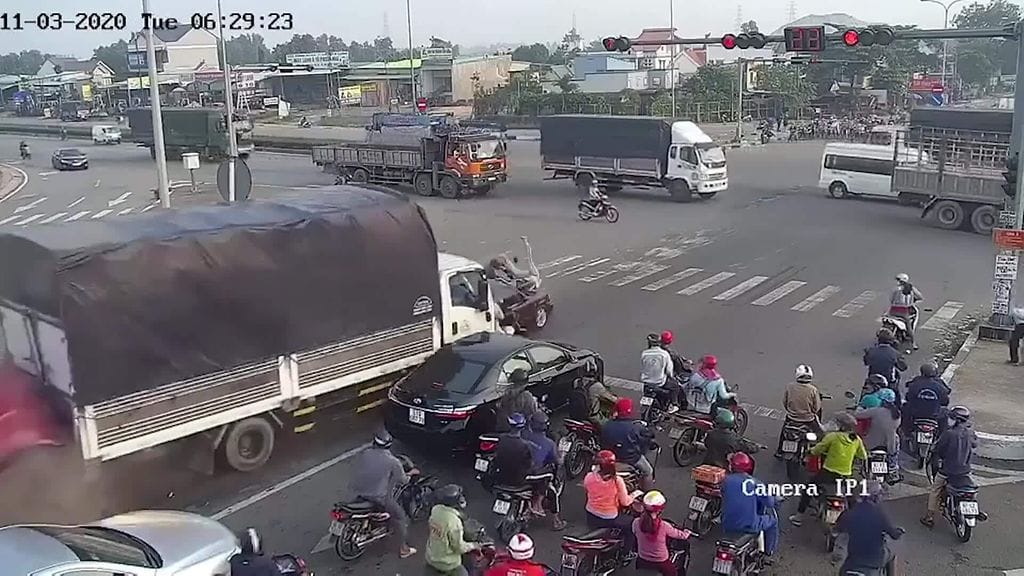 Valvontakameran kuvassa näkyy, miten kymmenrenkainen kuorma-auto törmää ensin pienempään rekkaan, joka puolestaan törmää edessä olevaan autoon ja mopoilijoihin.