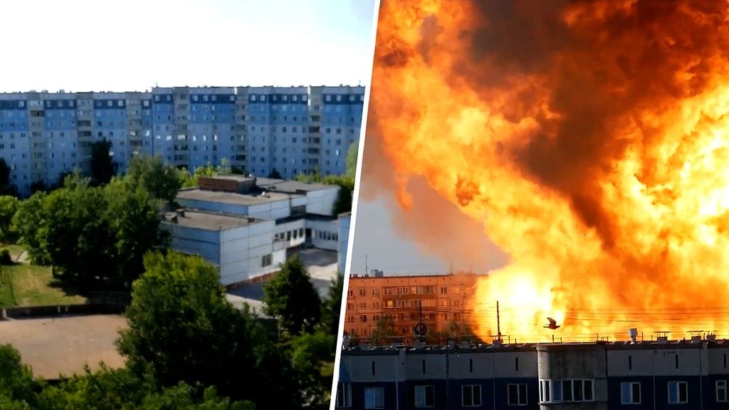 Videolla näkyy tulipalon rajuin hetki, kun yhtäkkiä kerrostalojen välissä räjähtää huoltoaseman polttoainesäiliö.