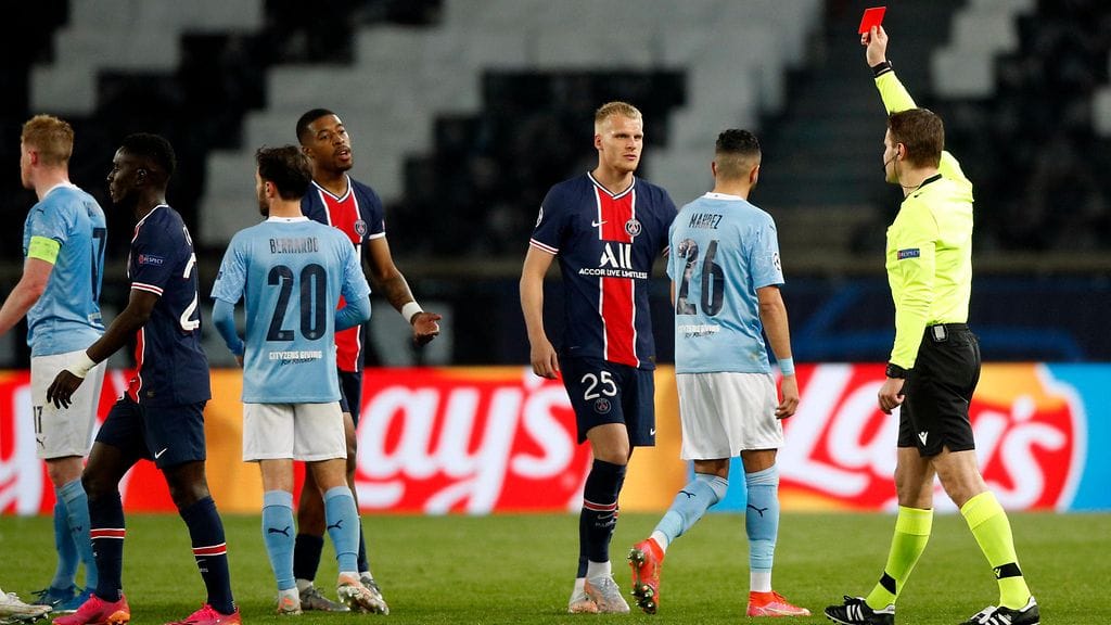C Moren studiossa tuomittiin PSG:n Idrissa Gueyen ruma taklaus jalkapallon Mestarien liigan välierien avausosaottelussa Manchester Cityä vastaan.