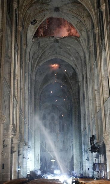 Kuvien perusteella osia katedraalin katosta romahti rakennuksen sisälle. Savuavat kappaleet täyttivät katedraalin keskikäytävää. Kuvista näkyy myös kattoon jäänyt ammottava aukko.