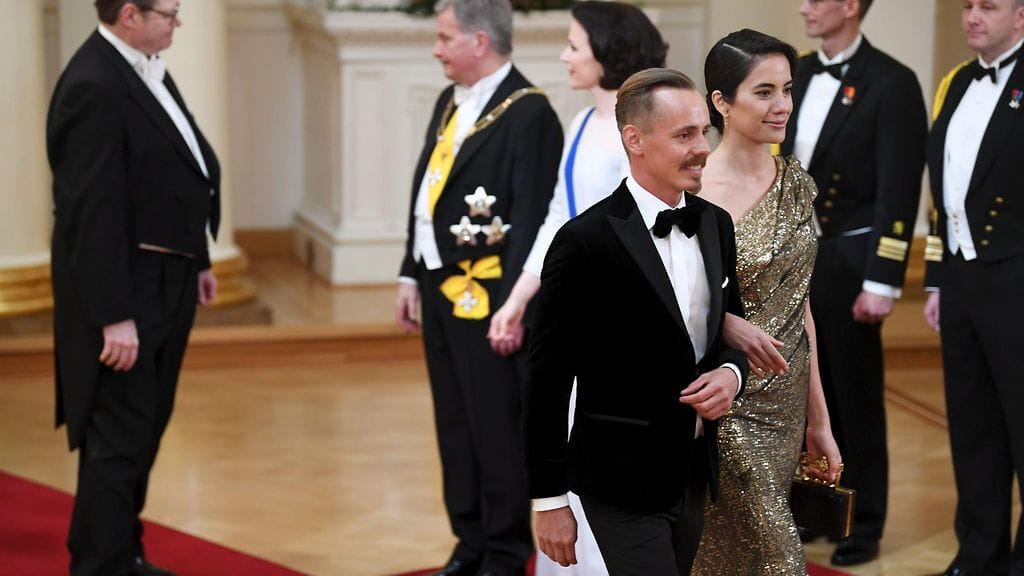 Näyttelijä Jasper Pääkkönen saapui Presidentinlinnan itsenäisyyspäivän vastaanotolle naisystävänsä Alexandra Escatin kanssa.