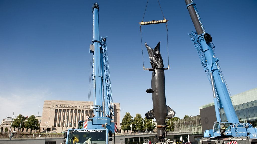Helsingin Musiikkitalon edustalle alettiin tänään aamulla pystyttää oululaistaiteilija Reijo Hukkasen mittavaa Laulupuut-veistosta. Niin ohikulkijat kuin taiteilija itse näpsivät valokuvia, kun nosturi kiikutti valtavankokoista haukea paikalleen.