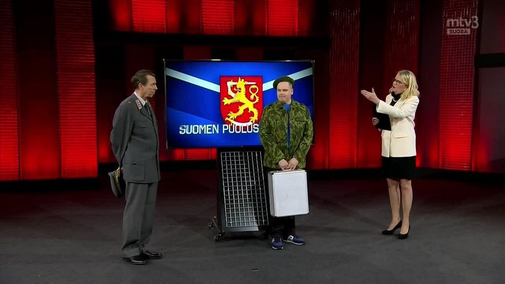 Kohtauksessa näyttelijät esittivät huvittavan tarinan, jonka aiheena oli Puolustusvoimat.