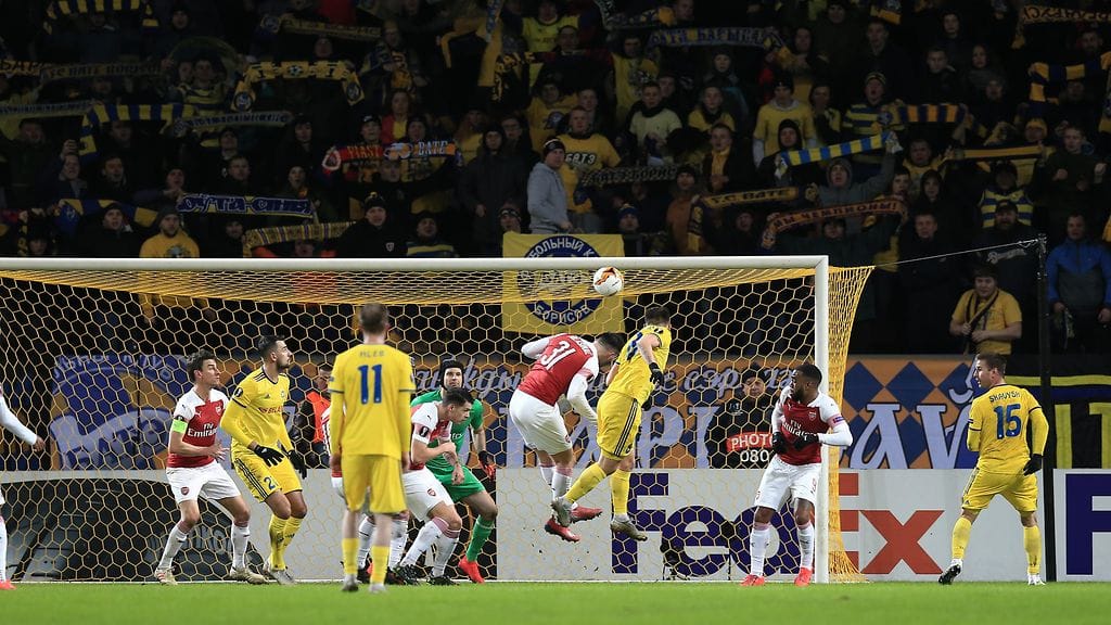 Valkovenäläinen BATE Borisov johtaa Arsenalia 1-0 jalkapallon Eurooppa-liigan 1. pudotuspelikierroksen avausosassa 45 minuutin jälkeen.