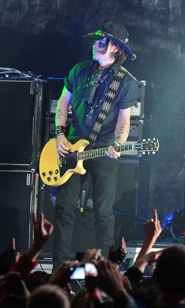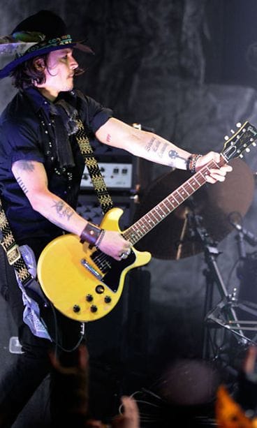 Johnny Depp, 48, on yksi Hollywoodin parhaiten palkatuimmista näyttelijöistä. Tähti on yhtä vakuuttava myös rokkarina. Mies nappasi kitaran ja hyppäsi Los Angelesissa lavalle muusikko Marilyn Mansonin, 43, kanssa keskiviikkona 11. huhtikuuta Revolver-lehden järjestämässä Golden Gods -gaalan konsertissa Club Nokialla. Depp on ennenkin.