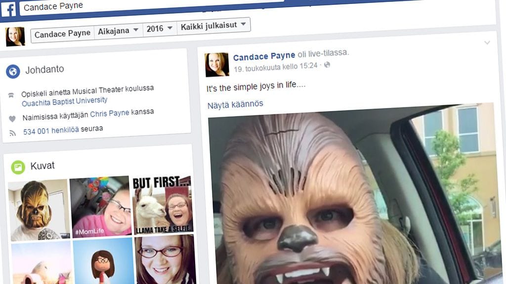 Texasissa, Yhdysvalloissa asuva kahden lapsen äiti Candace Payne julkaisi Facebook-sivullaan videon, jossa vetää päälleen Tähtien sota -elokuvista tutun Chewbacca-hahmon naamarin.