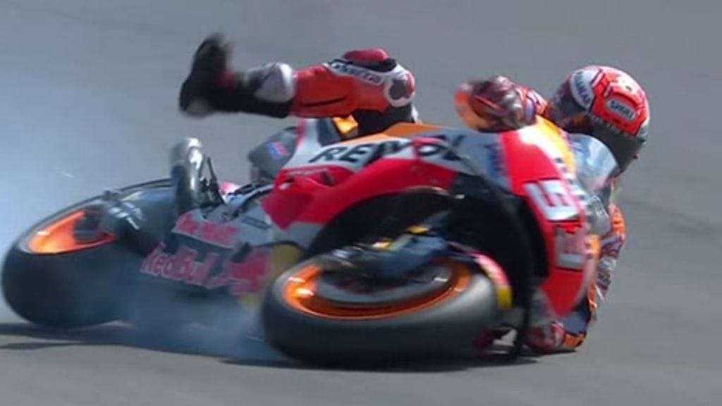 Honda-kuljettaja Marquez kaatui, kun aika-ajoja oli jäljellä viisi minuuttia. Marquez ei kuitenkaan luovuttanut vaan espanjalainen juoksi takaisin varikolle varapyörän selkään. Marquez onnistui vielä parantamaan aikaansa, mutta aika riitti ainoastaan viidenneksi.