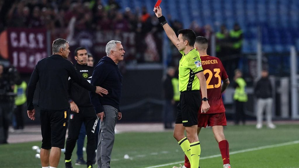 Piakkoin ottelun päätuomari Antonio Rapuano kääntyi Mourinhon suuntaan. Punainen kortti ja José pukukopin puolelle.