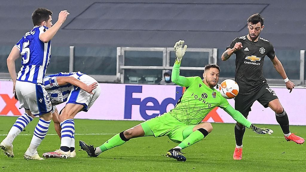 Marcus Rashford keskitti pallon kohti rangaistusaluetta, ja pelivälineeseen yritti Unitedin Bruno Fernandesin ohella iskeä kolme Real Sociedadin pelaajaa. Tulos: nämä kolme Sociedad-pelaajaa törmäsivät toisiinsa ja Fernandes pääsi kiittämään sekä tuikkaamaan pallon verkon perukoille.
