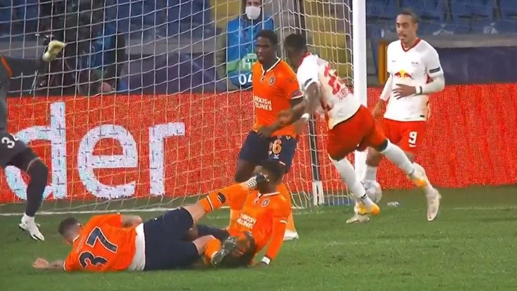 Istanbul Basaksehirin puolustajat Martin Skrtel ja Boli Bolingoli-Mbombo törmäsivät kivuliaasti toisiinsa jalkapallon Mestarien liigan ottelussa RB Leipzigia vastaan.