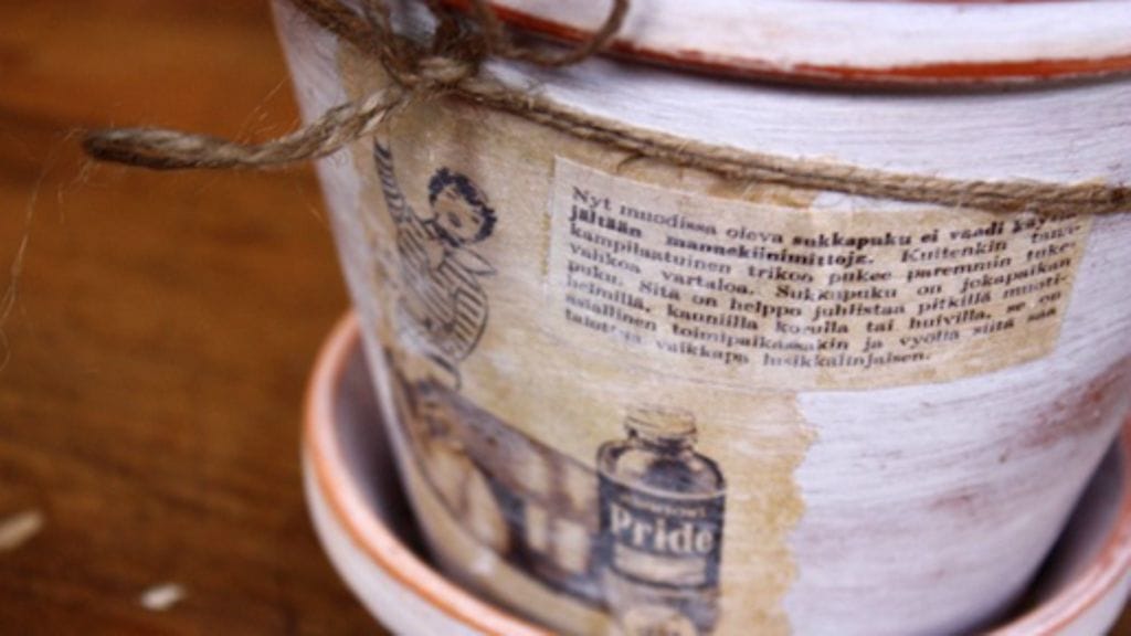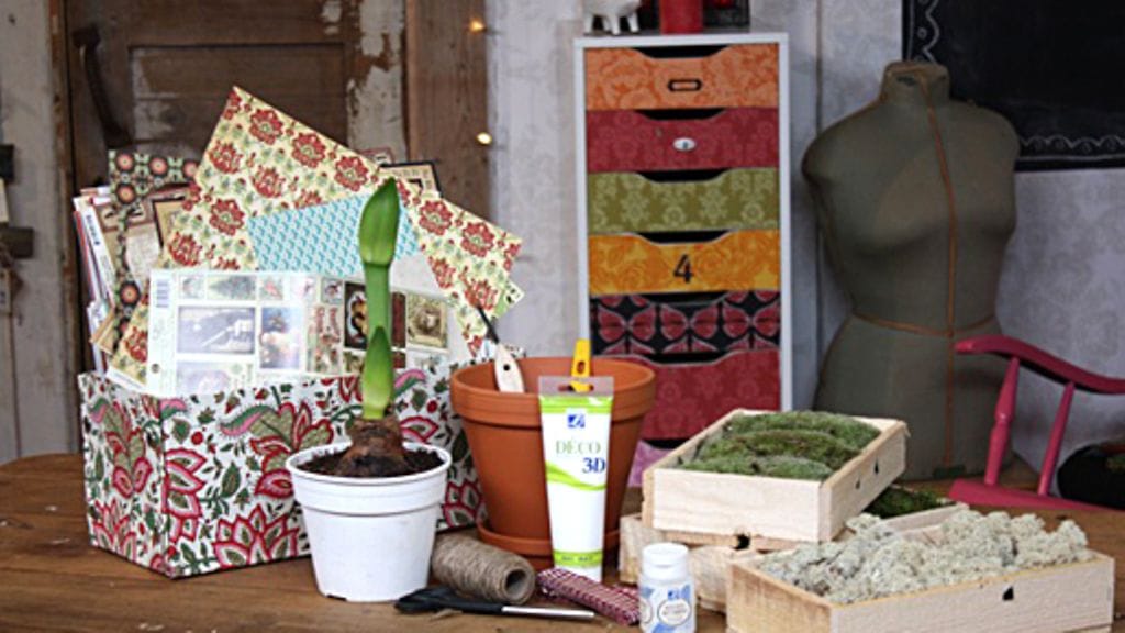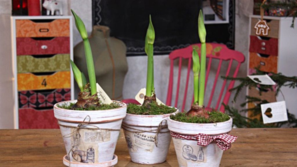 Viime hetken joululahjat syntyvät käden käänteessä, kuten nämä joulukukka-asetelmat. Anu on hankknut pelkän amarylliksen ja saviruukkuja. Hän maalaa valkoisella maalilla ruukut maalilla ja hioo/ kuluttaa maalipintaa hiomapaperilla. Ruukut koristellaan vanhoista naistenlehdistä leikatuilla kuvilla, istutetaan kukka ruukkuun ja viimeistellään sammaleella ja jäkälällä.