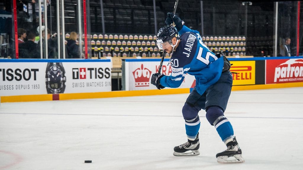 Juhamatti Aaltonen treenasi tänään Leijonien ykkösketjussa, mutta huomisen Norja-ottelussa hän on ylimääräinen pelaaja.