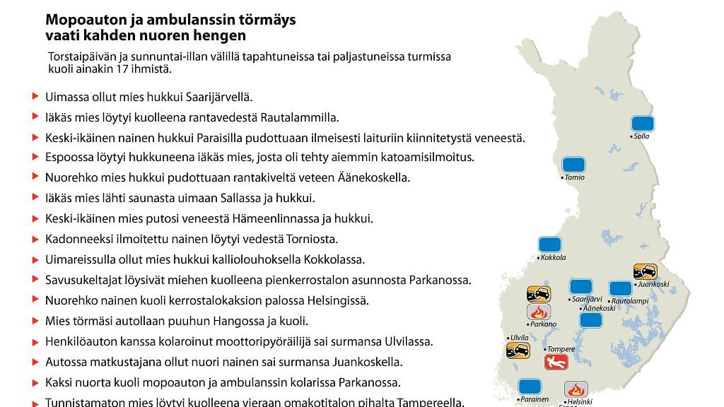 Alla olevaan karttaan on koottu juhannuksen onnettomuudet. Kartasta puuttuu Kankaanpäästä löydetyn hukkuneen lisäksi torstai-iltana Kokkolassa sattunut ruohonleikkuriturma. Sanomalehti Keskipohjanmaa kertoi, että ruohonleikkurinsa alle jumiin jäänyt mies kuoli vammoihinsa. Poliisi epäilee turman syyksi sairauskohtausta.
