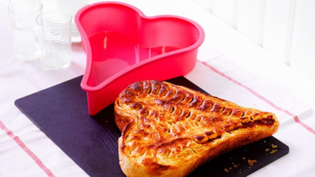 Käytä sydämen muotoista piirakkavuokaa, jos sellainen on, mutta voit valmistaa piirakan myös muun malliselle piirakkavuoalle. Kauli Isoa Lehtitaikinaa noin puolet ohuemmaksi. Leikkaa levystä vuoan kokoinen pala kansilevyksi piiraalle (jätä se pöydälle odottamaan). Kauli lopusta taikinasta vuoan + reunojen kokoinen levy vuoan pohjalle. Levitä täyte pohjalevylle vuokaan. Nosta kansi päälle. Sulje reunasaumat hyvin nipistäen yhteen. Kuvioi pinta saksien kärjellä.