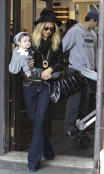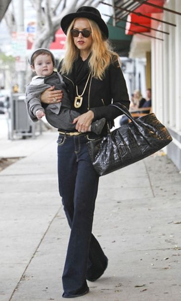 Julkkistylisti Rachel Zoe bongattiin iltapäiväkävelyltä yllään farkut, joissa oli vaarallisen pitkät lahkeet. Moni muu olisi varmasti kompastunut lahkeisiin, mutta stylisti onnistui pysymään pystyssä ja vielä vauva sylissään.
