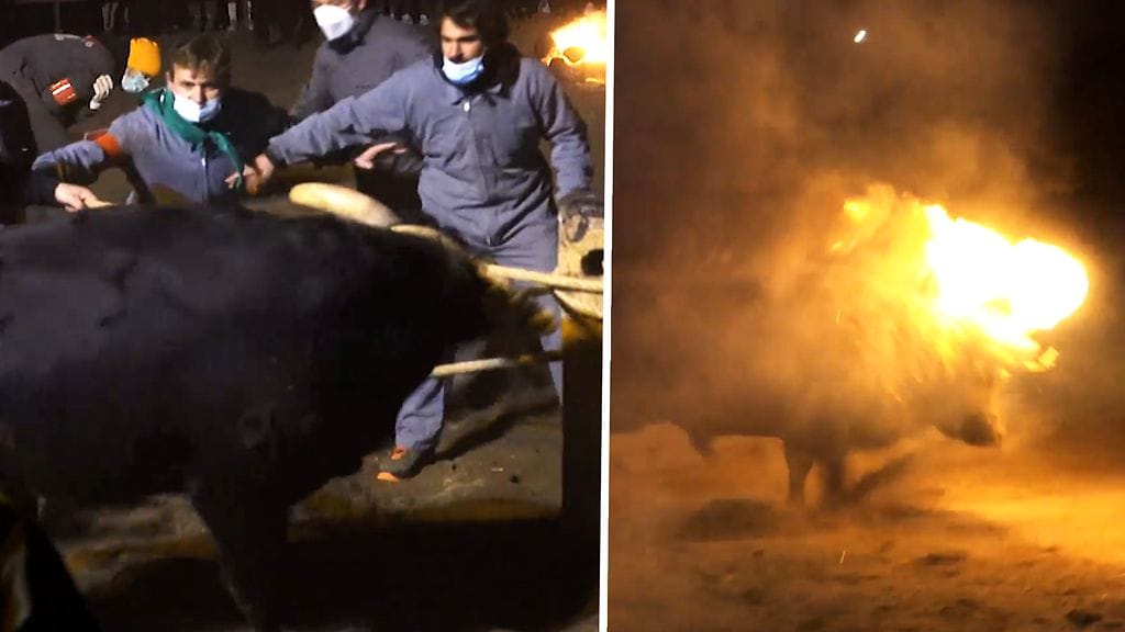 Dramaattisella videolla härkä sidotaan kiinni, minkä jälkeen sen sarvet sytytetään tuleen.